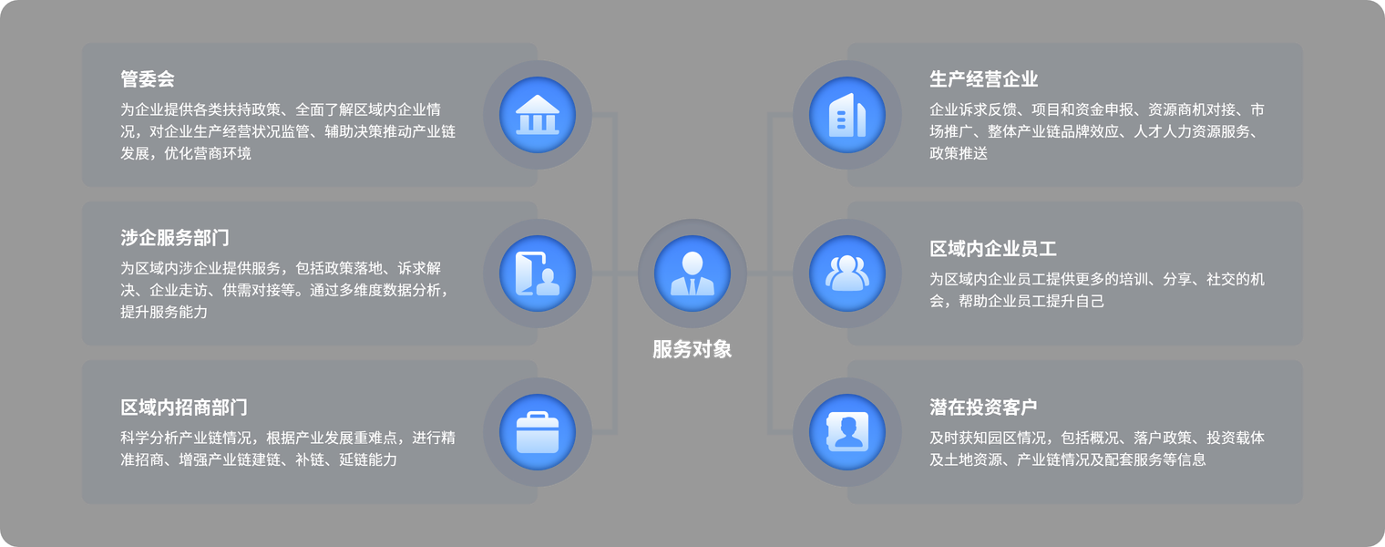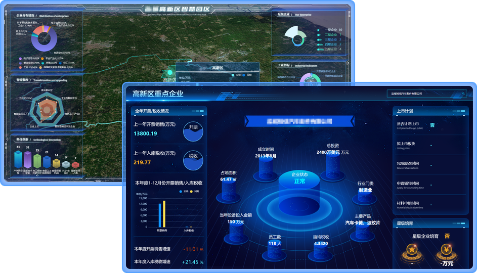 展示园区总体概况 地图缩放可搜索园区的规上企业 对企业的概况一目了然 便于园区进一步的政策指导。