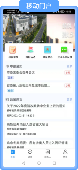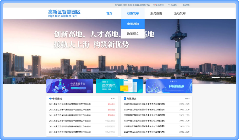 实现园区资讯、政策服务、申报服务、活动等信息的发布。