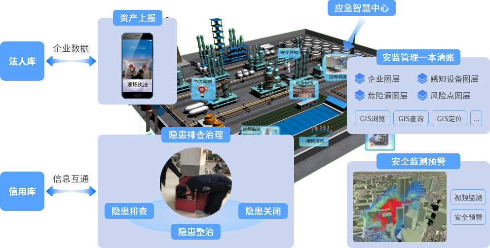 基于GIS地图叠加监管企业、危险源、 风险点和感知设备等图层,建立移动安监体系。
